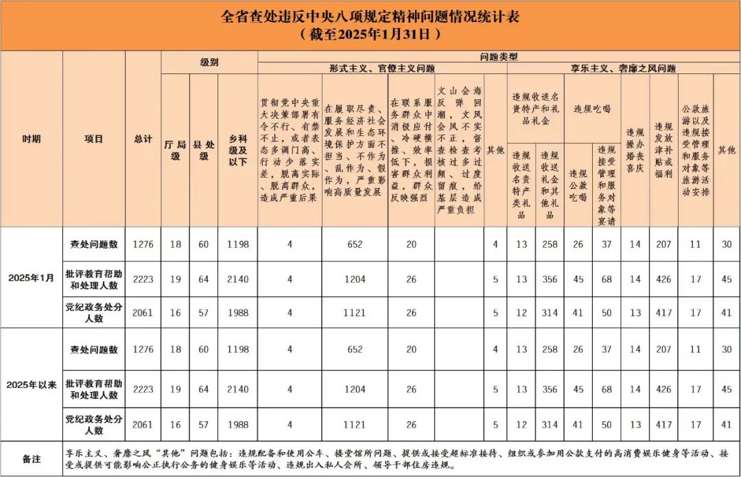 2025年1月全省查处违反中央八项规定精神问题1276起