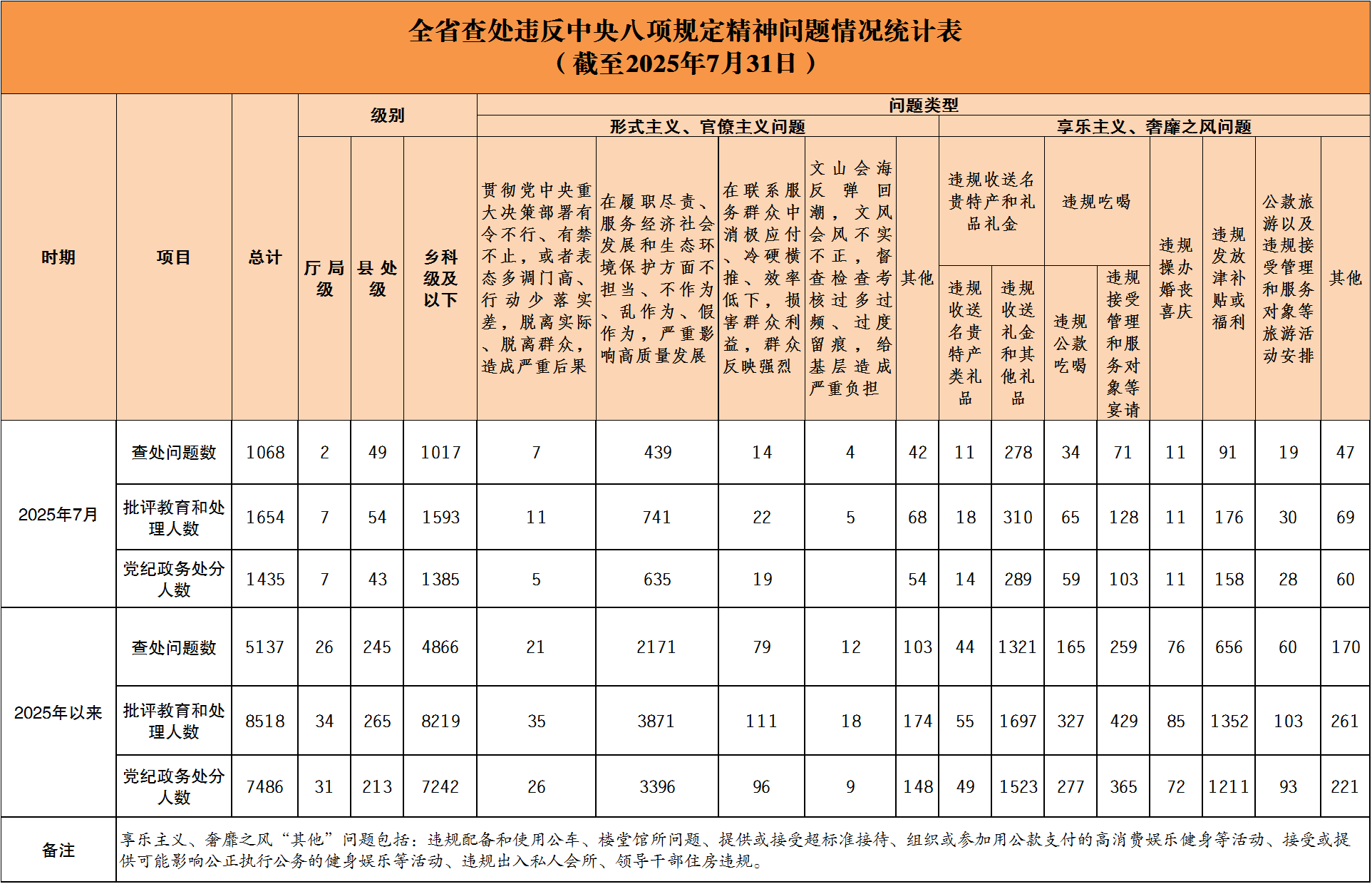 湖南省纪委监委深入贯彻中央纪委国家监委工作部署,在全省各地各部门各单位建立了落实中央八项规定精神情况月报制度。2025年以来,截至7月31日,全省查处违反中央八项规定精神问题情况如下: