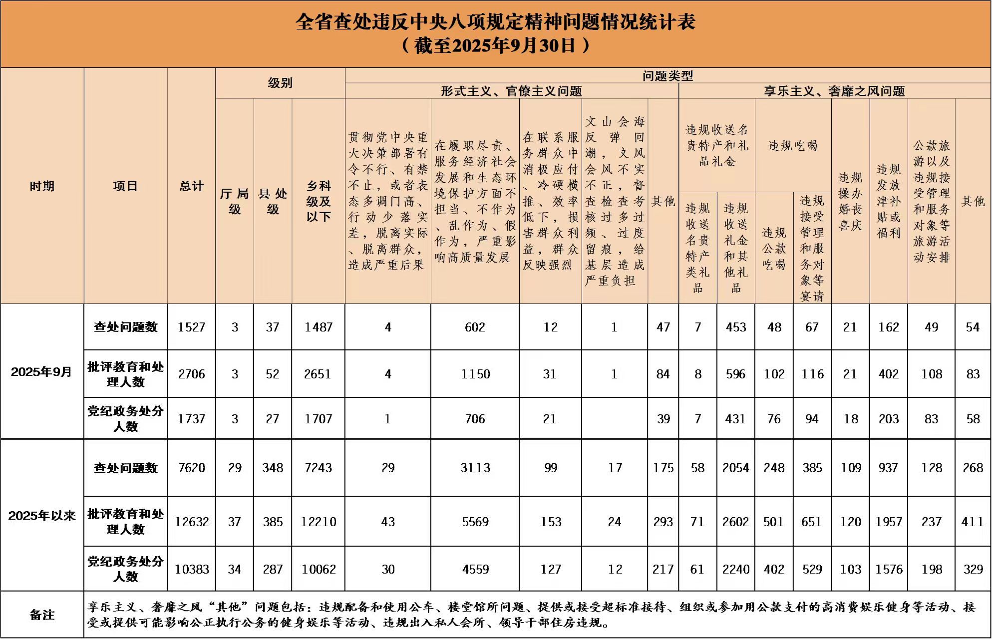 湖南省纪委监委深入贯彻中央纪委国家监委工作部署,在全省各地各部门各单位建立了落实中央八项规定精神情况月报制度。2025年以来,截至930日,全省查处违反中央八项规定精神问题情况如下: